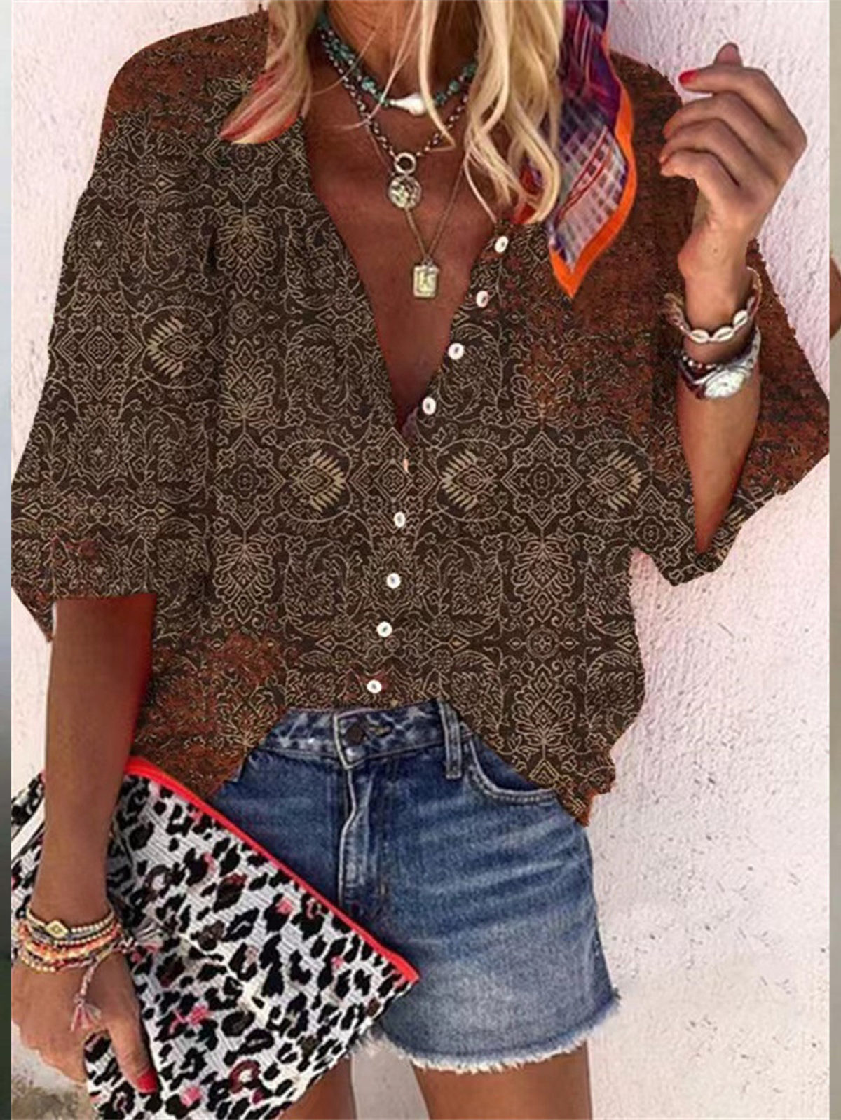 Cuello Subido Casual Étnico Blusa